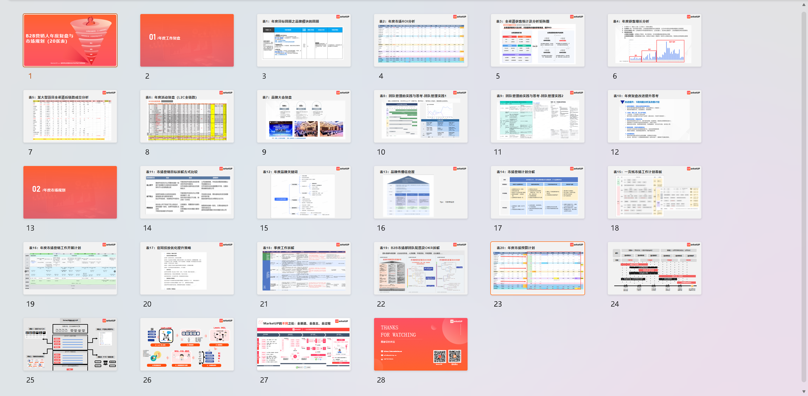 从年度目标回顾(表 1)到市场 ROI 分析(表 2),从全渠道获客统计(表 3)到大型项目成交复盘(表 5),再到团队管理(表 8-9)和预算计划(表 20),完整串联「复盘 - 规划 - 执行 - 优化」四大环节,新手也能按图索骥。