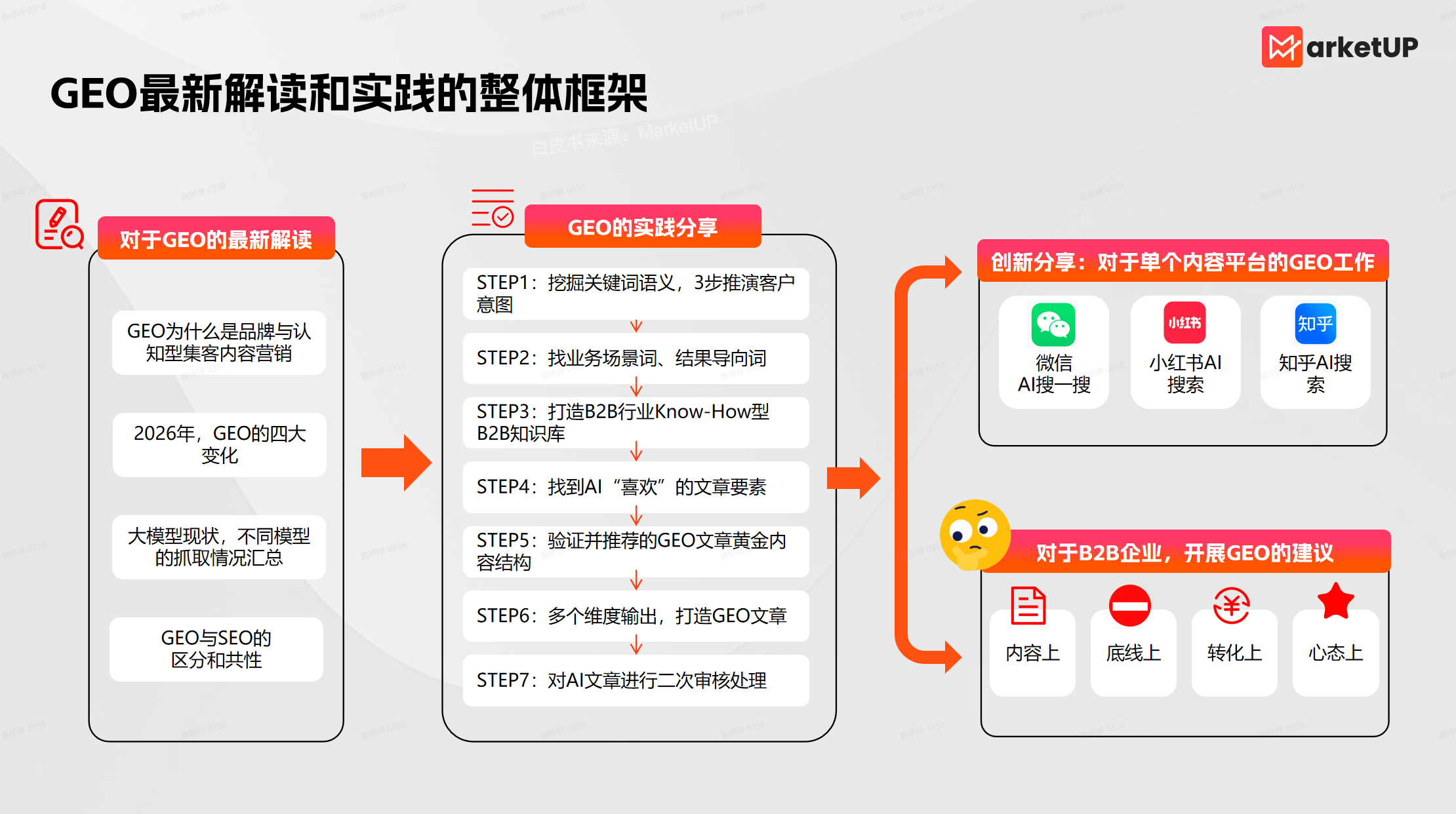 面对 AI 技术的狂飙突进,MarketUP认为2026年大模型不仅不会取代优秀的营销团队,反而会成为企业构建核心护城河的最强杠杆 。为了帮助 B2B 企业完成这场认知与技能的升级,MarketUP 团队将数月来的实战经验浓缩成了这本《B2B Vibe Marketing :AI内容+GEO实战白皮书》 。破局的关键,就在于企业能否打造出独属的“Vibe Marketing”,以及是否拥有一批懂得驾驭它的市场营销人才 。